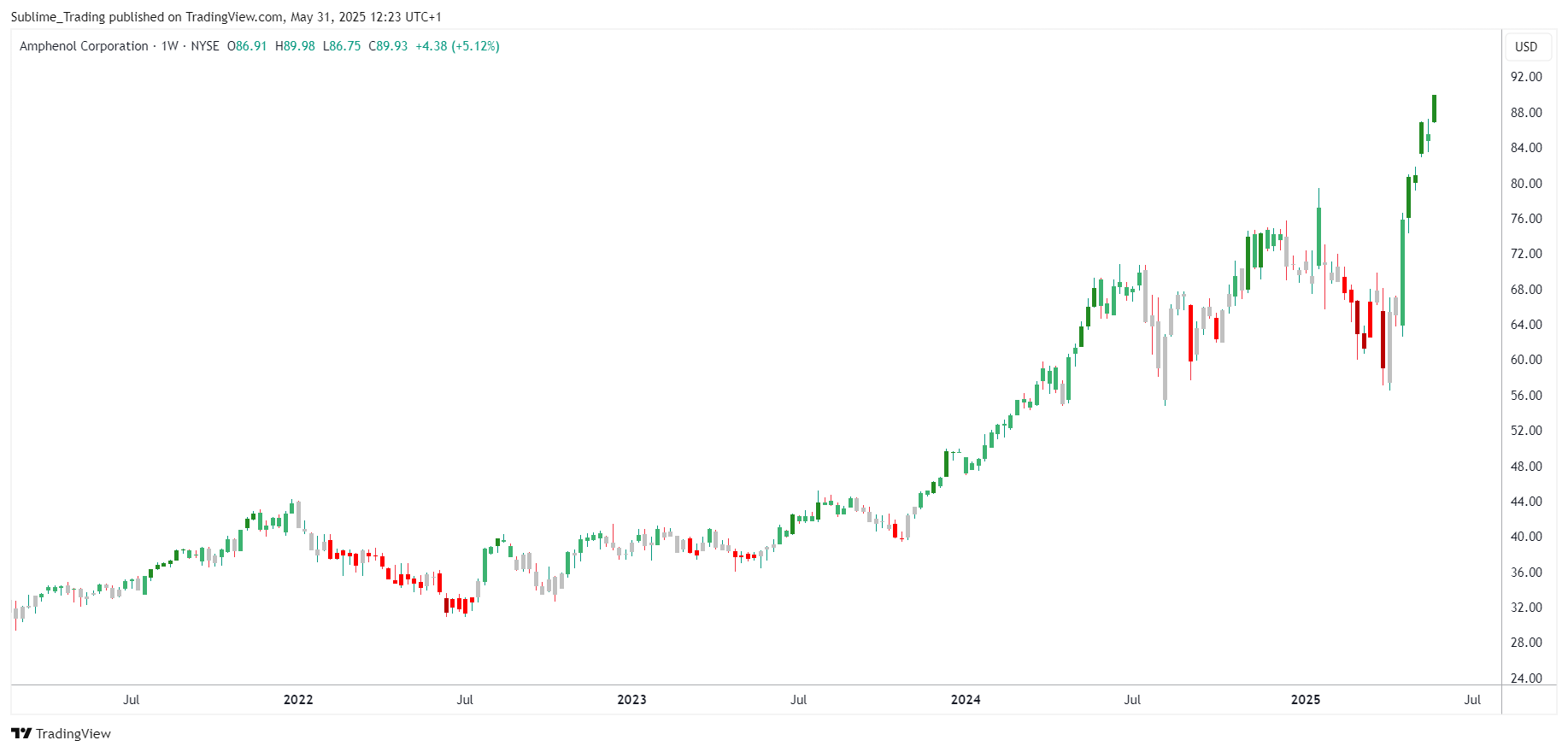 Looking at the monthly chart for Amphenol, the stock is in a clear long-term bullish trend. It had a strong performance in May, opening the month with a gap up from the previous month’s close—a sign of strong upward momentum. By the end of May, the stock was up 16.89%. For the year so far, it has gained 29.69%, showing a solid upward move. If this trend continues, the next major resistance level to watch is the $100 mark, a key psychological level.