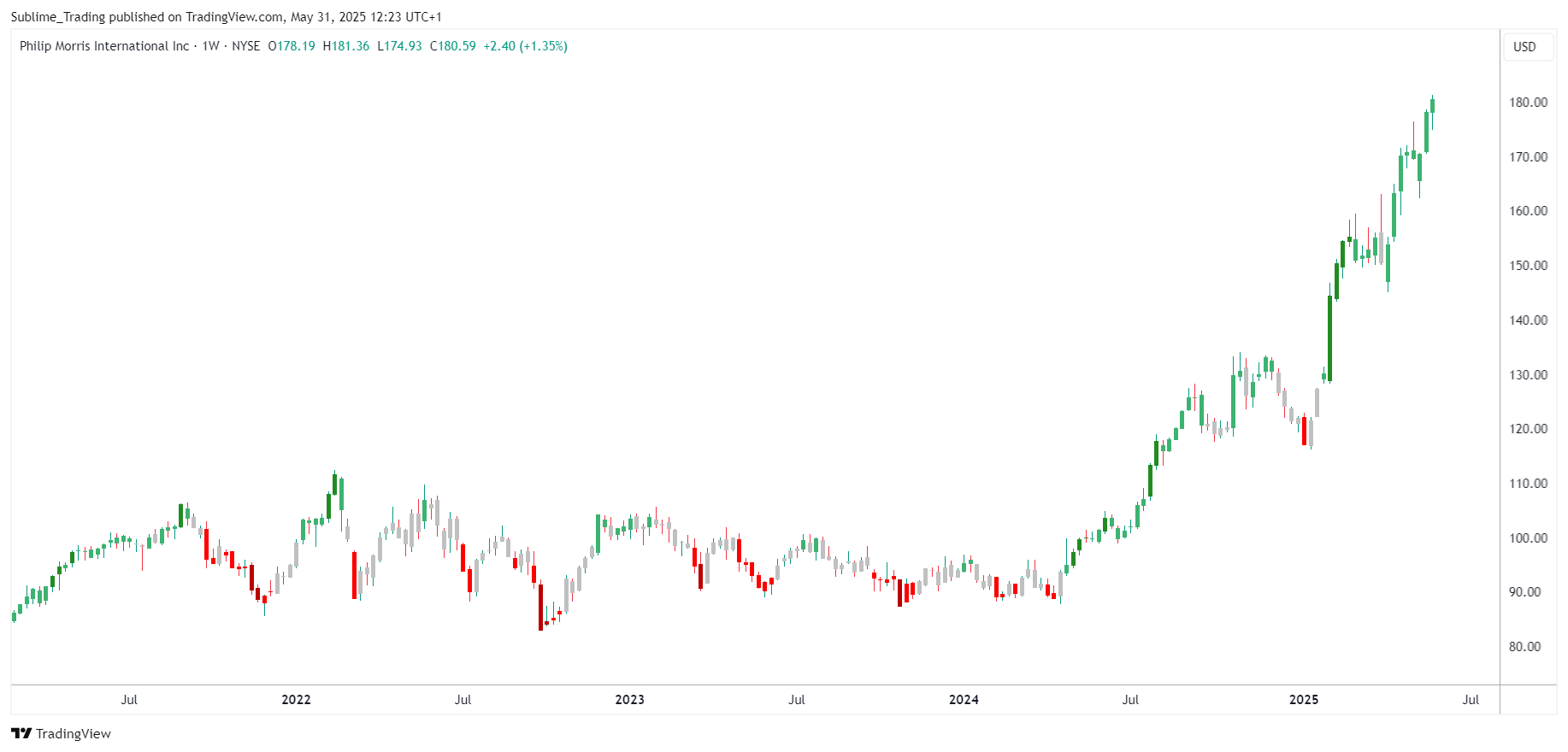 Philip Morris International is performing well, showing a strong uptrend with significant gains in May. The stock closed May up by 5.41%, and for the year, it’s up nearly 50%. The next key resistance level to watch is around $200.